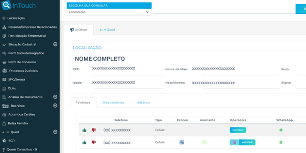 Descubra o InTouch, a plataforma multiconsultas da Unitfour que reúne, em um único lugar, tudo que sua empresa precisa para tomar decisões com segurança: desde consultas de dados cadastrais, passando por análise de crédito, até validação de identidade e prevenção à fraude. Com uma assinatura mensal, você contrata exatamente o que precisa e paga pelo que utiliza.